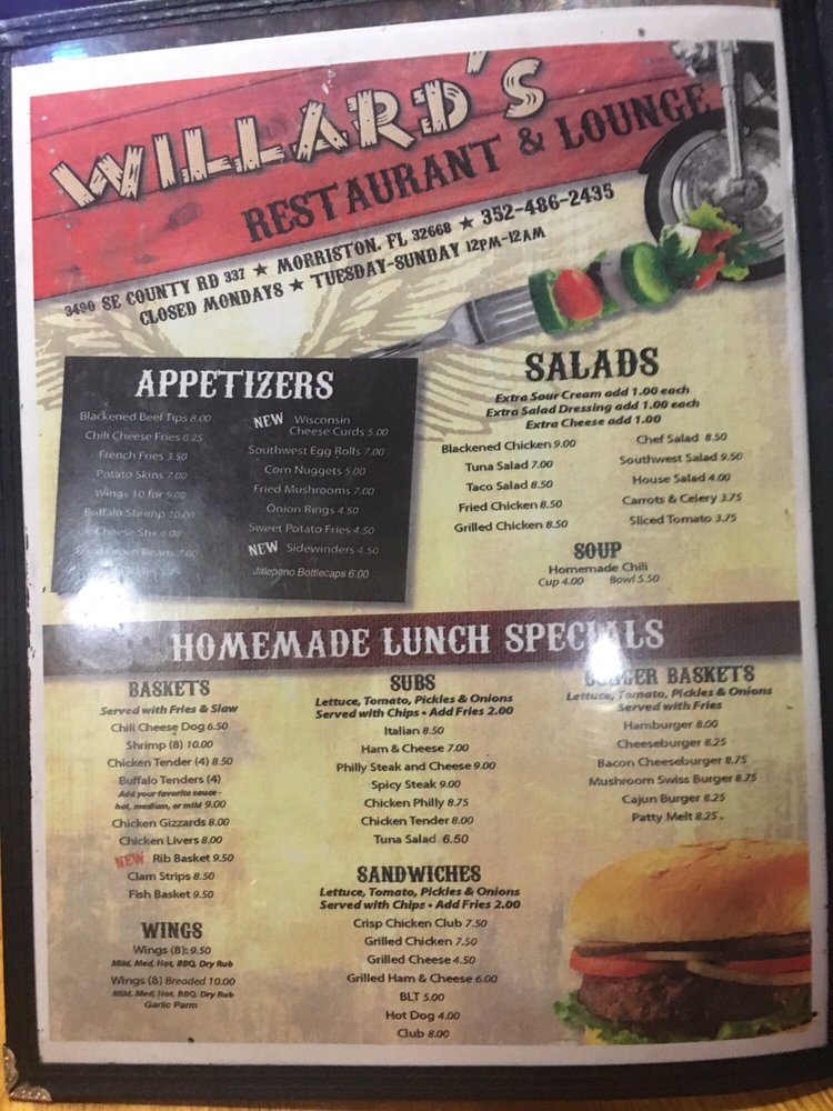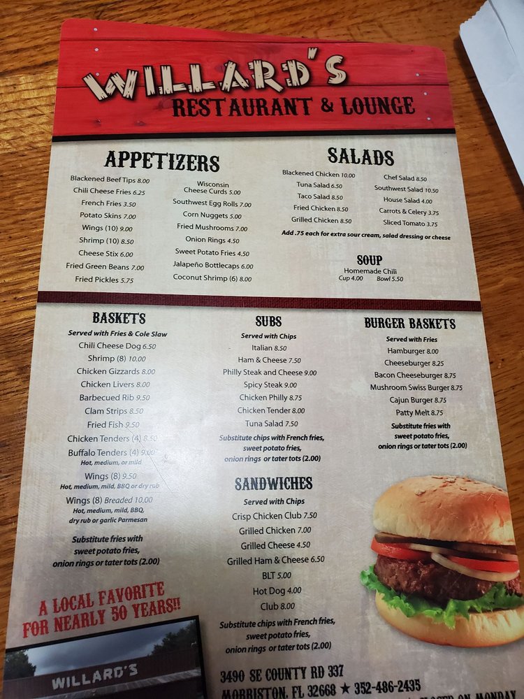Welcome to Willard's Restaurant & Lounge, a delightful gem nestled in Morriston, FL. As a hub of New American cuisine, this inviting space strikes the perfect balance between casual dining and an energetic atmosphere. Whether you're dining indoors or enjoying the heated outdoor seating, Willard's is designed to cater to every occasion.